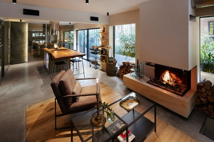 Another spot comprising a cozy fireplace for gathering with friends and relaxing is organised next to the kitchen. The bright panoramic views of the outdoor greenery is provided by the floor to ceiling window. The upper floor is planned such that it serves as an added space for photo shootings if required, as maximising space for photographic work was one of the targets of the project. The result has been the creation of a ‘loft’ space that serves various functions, entwined with each other, under the roof of a photographic studio.