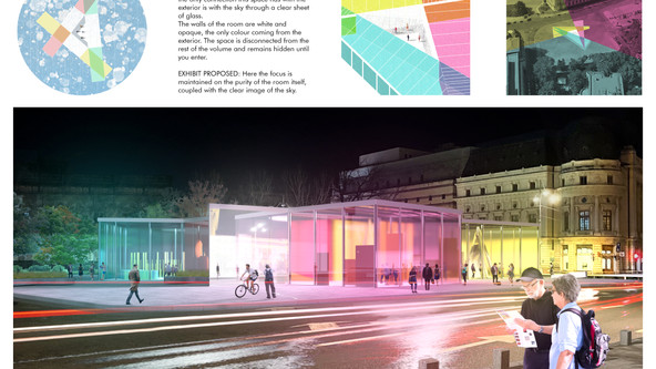 The volume represents the interconnections of those paths and reduces them to sensations involving the major senses of every area of the site. The volume opens perspectives to major exponents of the city Victoriei Avenue, The National Museum of Art and the Romanian Athenaeum. The prisms intersect each other, letting the different senses and characteristics of the prisms progressively melt into each other. The sharp angle of the volumes marks a progressive departure from the reality of the outside to more abstract and concentrated experiences. In the middle of the volume at the confluence of all the prisms there is a hidden space only connected with the sky, a pure space for people to reflect on their senses and the way they will use them once they reconnect with the city.