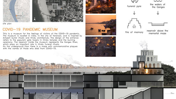 The museum is located in India, in the city of Varanasi, and is inspired by some aspects Hindu culture. The design of the entrance refers to the gopuram gate towers in Hindu temples and the burning ceremony - an important part of the funeral ritual (the body of a deceased person is hoisted on folded firewood, which is folded in a special way and poured with ghee and special aromatic liquids, and the son of the deceased person lights a fire with a torch and reads a prayer at the same time. Other family members at this moment scream and loudly mourn the deceased person with special ritual lamentations). I decided to use this reference after I saw a photo where the orderlies burn the corpses of those who died from COVID-19. The entrance faces east, as in Hindu temples.