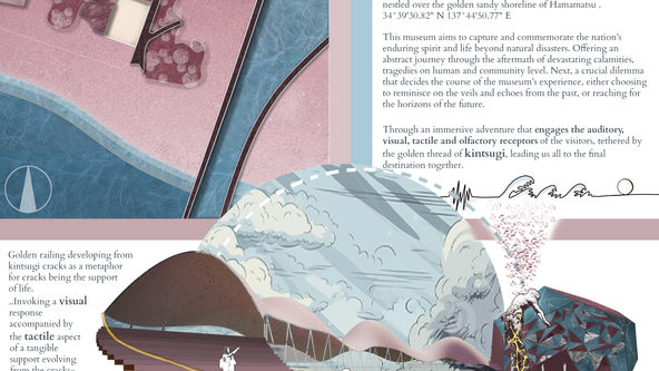 The museum thus aims to encapsulate this journey from calamity to peace, a sensorial odyssey of the land of Japan and its natural forces and artful healing -the final destination. It stands as a sanctuary depicting a tale of the aftermath of calamities, the lives of the victim and the gallant spirit of the survivors. As the visitors would navigate within the museum, engaging their auditory, visual, tactile and olfactory senses, they would experience a myriad of emotions, ranging from angst, sorrow, misery, hope, grit, nostalgia, empathy, peace and so on. The design achieves this by incorporating interactive tactile walls, rhythmic level differences, creating astounding visuals through light effect and transparency, accompanied by echoes of the ocean waves afar.