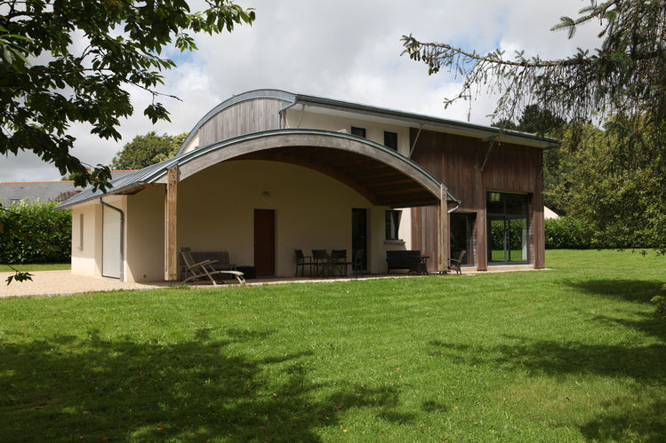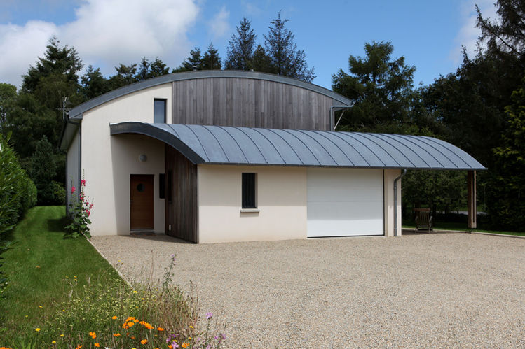 Complying with these specifications, the architect came up with a bioclimatic design integrating a wood and concrete frame, metal beams and a zinc clad arched roof which provided a quality of comfort, practicality and space. In a break with tradition, the harmonious lines of the house influenced by organic architecture thus set up a habitat close both to nature and its inhabitants.