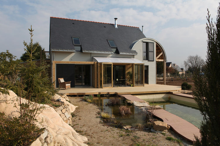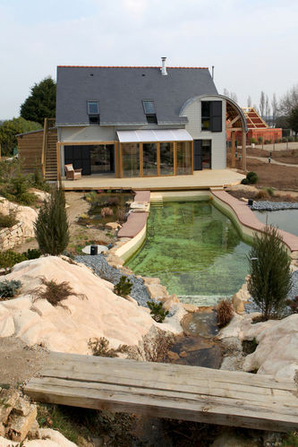 This dwelling located on the shores of the Golfe du Morbihan, near AURAY, was constructed using organic architectural principles with an accumulation of green energy components for peak performance without utilizing technical refinement. This house is benefitted, being located in the oceanic climatic conditions. The project was formed of the owners’ wish to build a new house on their property in BADEN, incorporating a landscaped garden and a natural, chemical free swimming pool. These were built before construction started on the house in association with a designer and a landscape gardener. A unique character emerged from this later, natural environment surrounding the construction site.
