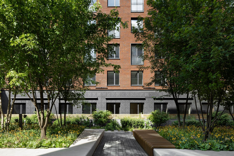 There is a yard with all modern conveniences in the complex, too. A green oasis and a small playground point out the Bolshevik’s dwelling function, add coziness to the space, and increase the level of tranquility a residential compound, and especially a space that fuses personal and business aspects, needs. Dwellers can have a rest outdoors on well-furnished landscaped roofs of the residential compound, too.