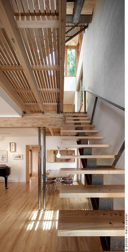 The stair made of steel and wood sits in this big volume opened up on three floors. We experiment this light filled space going up the stair that was designed with as few materials as possible (one central stringer, minimal railings, floating steps and the top landing in steel trellis) to emphasize this impression of an object that lets light go through.