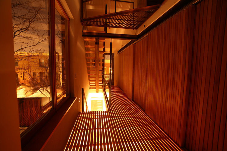 The long wall made of sliding wood panels that separates the bedrooms from the rest of the house at night, opens up in the morning. The bedrooms then become vast and bright. They take advantage of the double height space that brings light from the third floor windows. From the bridge we can also see the living room through the semi-transparent floor and interact with the people below.
