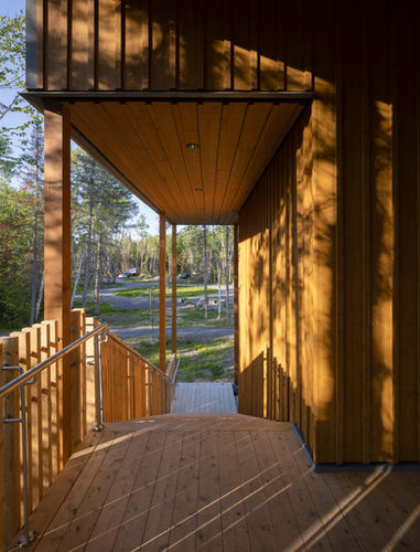 The Camp de Touage Service Center combines a coherent and poetic architectural resolution with its natural environment. In direct relation to the mission of promoting the resort and the general public vocation of the SÉPAQ, it evokes territorial and historical references related to the log drive and forestry, integrates the route of the Vélo route des Bleuets, and favors the discovery of the site in an enveloping wooden case by all visitors to the region.