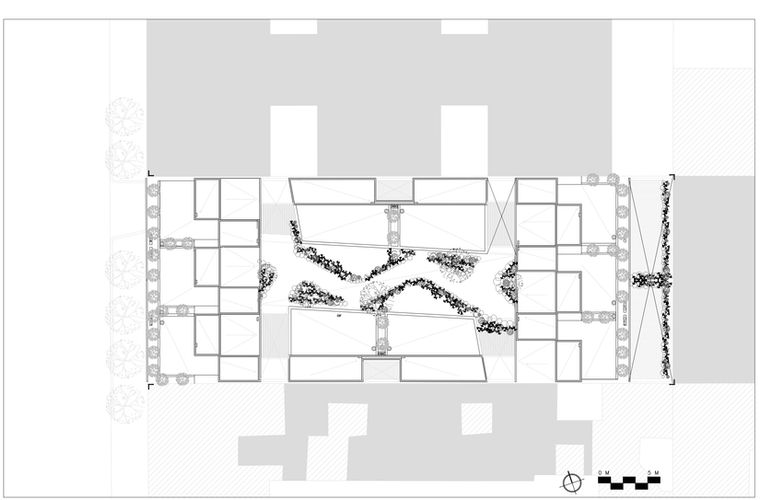 The project is developed to live towards the interior of the complex through a central courtyard and a rear patio separated from the back boundary, allowing all residential units to have natural light and cross ventilation. The complex consists of 14 units, with 4 apartment-style units on the ground floor, and 10 three-level townhouse-style units located above.