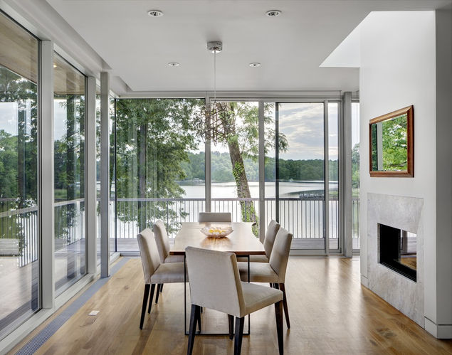 A new entry on the east facade divides the original south-facing volume from the den extension to the north, creating a breezeway with a water view and access to a wraparound desk. An exterior stair continues the breezeway sequence, which culminates in a rooftop garden. Inside, the living spaces feature a three-sided, storefront-like glass enclosure offering views to the south, west and north, with large sliding doors leading to the deck. The open plan of the kitchen, living and dining rooms is punctuated by a two-sided fireplace, which separates dining and living areas. Skylights on either side allow light to bounce off the surface of the chimney volume. The L-shaped kitchen has a 12-foot-long island, topped in Namibian white marble—the same material used for both fireplace surrounds.