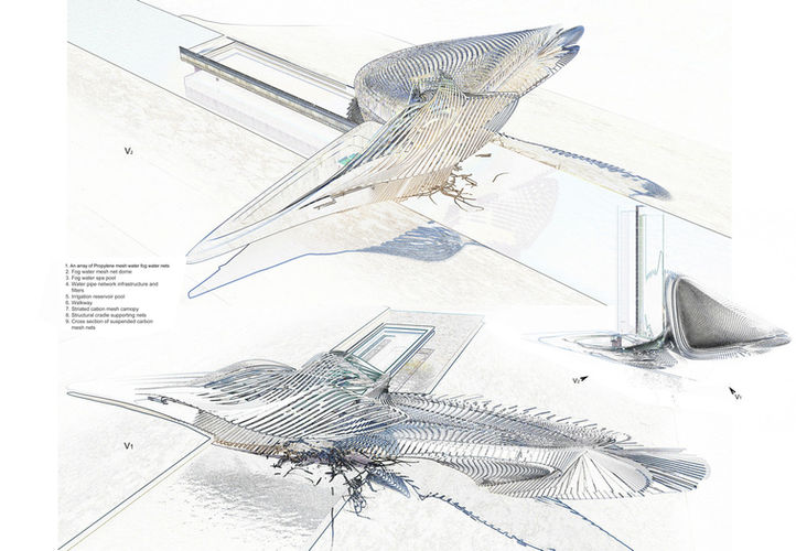 The water distribution network consists of solar pumps, pipes, valves, and a node-set of reservoirs and pipe intersections. This network connects the suspended polypropylene fog nets to the filters, reservoir, and pools. A dense cross-section of fog nets are draped over a series of cradles embedded into the site's ledge, its centre of gravity wedged into the site's rock substrate. Striated canopies stretch over the nets and pipes integrating habitable space with industrial engineered building elements that harness water from fog. The scheme incorporates a water distribution plant.