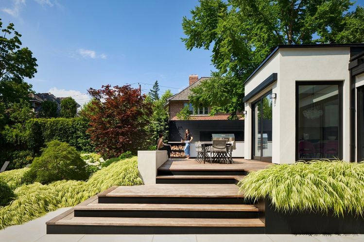 The exterior project began with Amantea’s association on an extensive renovation of the primary residence, led by Toronto firm Reigo & Bauer. The client chose to preserve elements of the existing landscape—notably the mature trees along the rear garden, which add to the backyard’s leafy seclusion—while extending the material palette and language of the house’s now-modern interior.