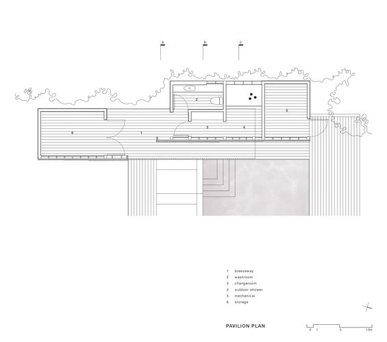 These glass panels admit ample daylight, reducing the need for artificial lighting while still providing visual separation; after dark, daylight is supplemented with tunable LEDs integrated into the ceiling. The pavilion’s core, finished with a warm and natural palette of marine-grade ply with cedar veneer and oiled cedar boards, is turned over to a washroom, a change room and a shower next to an opening in the roof that frames a birch tree and a view of the sky—zones deftly partitioned yet open to the surrounding landscape and pool activity.