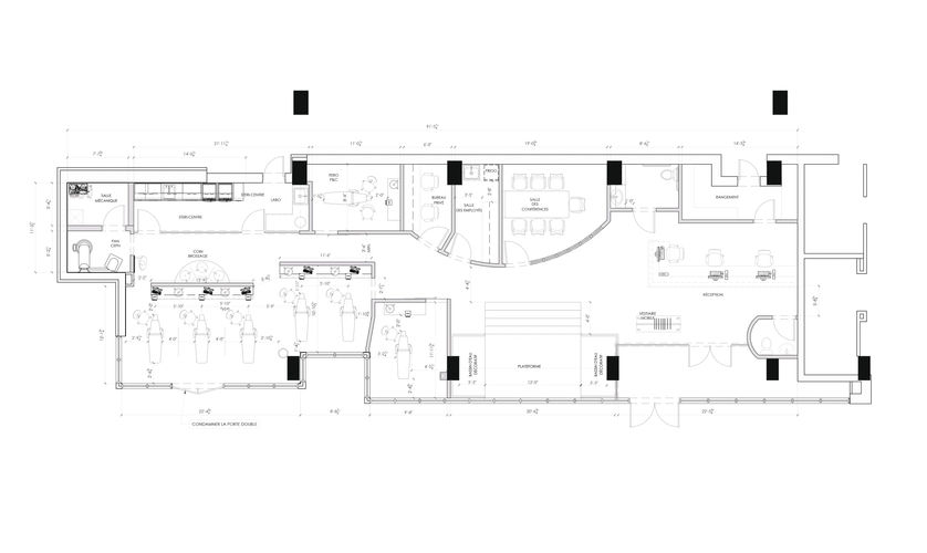 The orthodontic clinic located in Montreal’s Golden Square Mile on the ground floor of a condominium building was designed with the challenge to bring warmth to the coldly stark concrete-defined space. The idea was to transform the base material without masking it to create a contrast. The reference for the custom communal sink made of red demolition brick comes from the surrounding brick buildings in this downtown area.