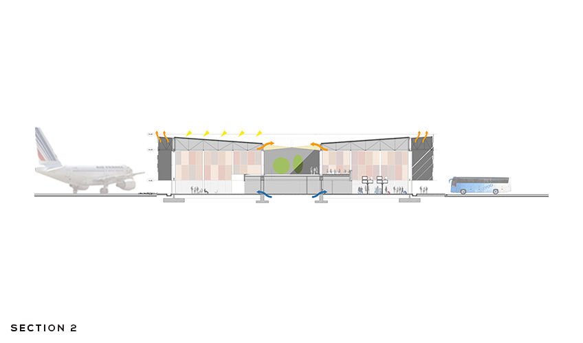 The terminal building consists of 2 double height halls that hold the waiting areas which open onto the landscape on one side and on the runways on the other, protected by wide overhangs and a light-filtering façade. The low-emissivity metal filter is a patchwork of perforated panels that draw the shade and colour the light, subtly evocating the decorative themes of the region. The linear main building located between the bonded zone and the duty free zone is topped with a patio that provides natural light to the heart of the building.