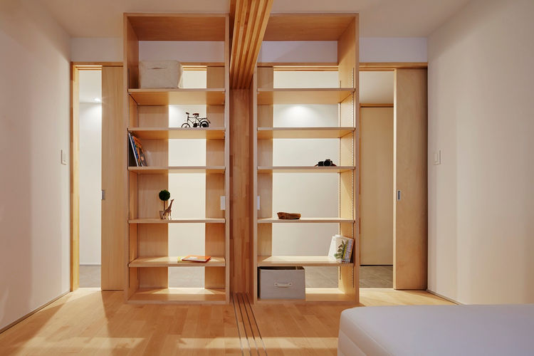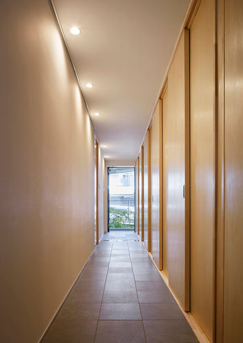 Therefore, we decided to separate the bedrooms and the corridor with 10 continuous sliding doors instead of walls. The 10 sliding doors ride on two rails, allowing you to control the connection between this side and the other side. If you open them, the light from the bedroom window gently illuminates the corridor in the morning, giving a feeling of openness. By finishing the corridor with tiles that are continuous from the entrance, we aimed to create a spacious and open feeling space like a Doma floor which is a soil floor of some traditional Japanese townhouses. The children's bed room can be separated by four sliding doors so that small children can have their own room in the future. And the shelves in the children's room can be used from the corridor by opening the sliding doors. By not erecting walls, the boundary between the room and the corridor is ambiguous.
