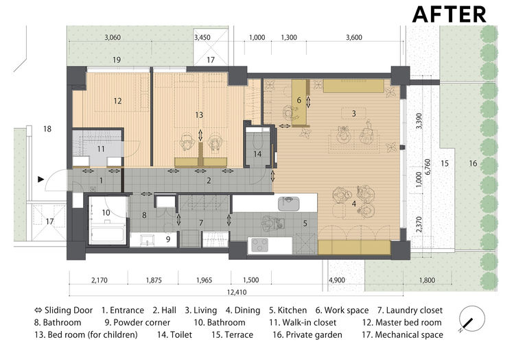 This is a project to renovate a dwelling unit in an 18-year-old apartment. Sliding doors have long been used in Japanese architecture. Japanese people have lived by using them such as shutters and Shoji screens to control how they connect with nature and people. Isn't it possible to utilize the device that controls the connection with the external environment even in a dwelling unit of an apartment? With that in mind, this renovation plan was considered.