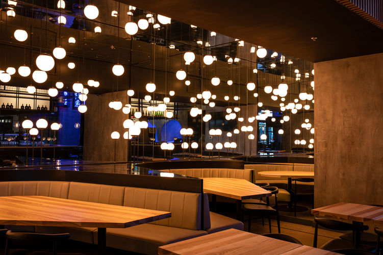 The first section, identifiable by a series of alcoves, focuses on games, represented by the blue neon symbols on the wall and influential in Japanese culture. The front section is reminiscent of an alley, with neon signs visible from the outside. The bar area, which is central to the design, is characterized by a lantern-like structure and is a tribute to the sake protocol. In addition to these areas, a VIP section differentiates itself through the distinctive visual experience that it offers to the client, formed by the infinite reflection of multiple suspended lights on the mirrored walls and ceiling. To complete the overall experience, particular attention was also paid to the washrooms, with each possessing its own decor and soundtrack.