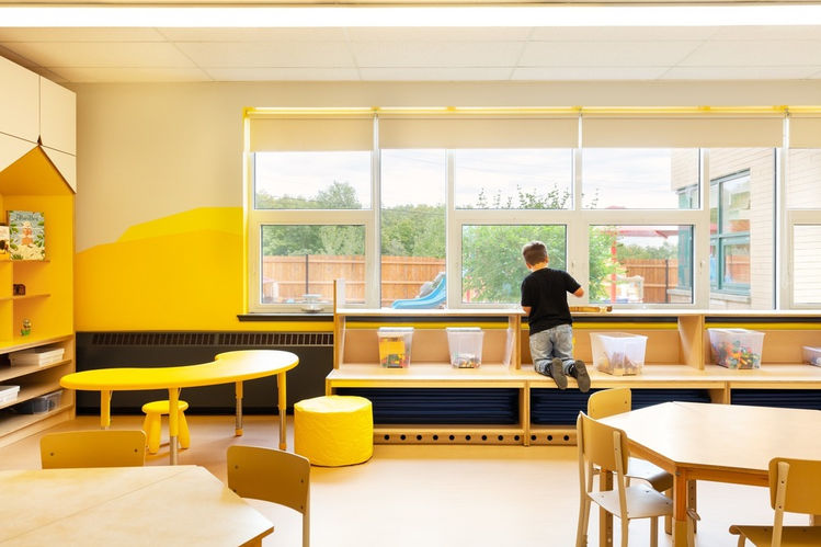 An easily identifiable room identification system for toddlers is established by assigning a separate colour and animal to each class. The applied colours to the walls suggest mountains and the emblematic animals were chosen from amongst those found in the wildlife surrounding Mont-Saint-Bruno.