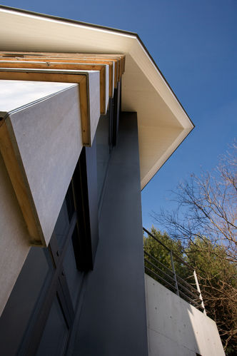 A massive structure, like the agricultural buildings that surround it, the house is both traditional in its morphology and ingenious in its use of materials. This is a house beyond the domestic scale, Shingled with raw fibre-cement panels on the walls and roof, simple and wither proof, capable of standing the test of time, The house is striated with bands of horizontal windows, giant louvers that cut the sun at its most powerful, with new points of view at each level. It is covered by its wimple from the hot summer sun and flooded with light in the winter, requiring neither air-conditioning nor heating on sunny days.