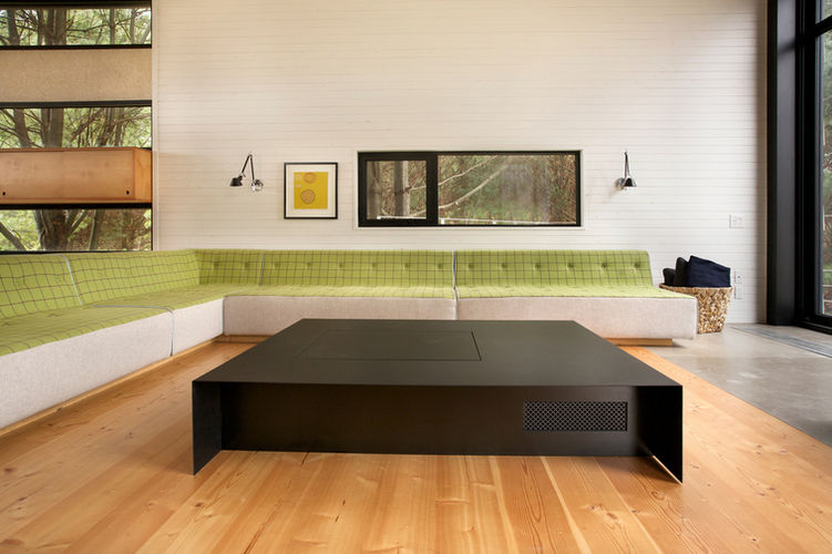 The interior is in wood, painted or natural, in planks or panels, designed almost entirely of made-to-measure furniture pieces: from the refectory table for meals to the day table with hideaway television set; from the large wraparound couch in the living room to the stainless-steel kitchen island; from the balustrade bookshelf along the stairway to the wall night-lights made of aluminum panels with cut-outs of fireflies, fish, and frogs; from wall-to-wall beds where people sleep foot-to-foot to overhanging bunk beds floating in the landscape.