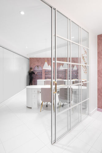 Two areas of activity were developed due to technical constraints and special ventilation needs. There is a nail application area, as well as a second area focusing on manicures and pedicures. The reception area delimits these areas and distributes the services.