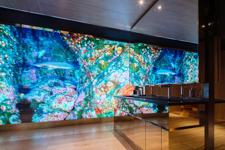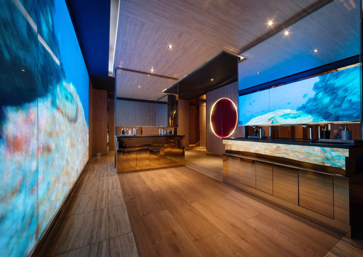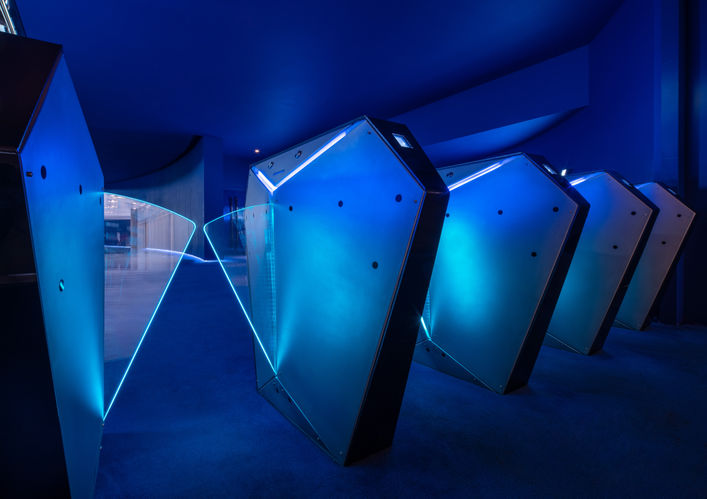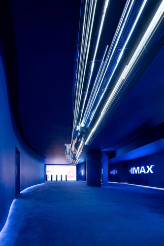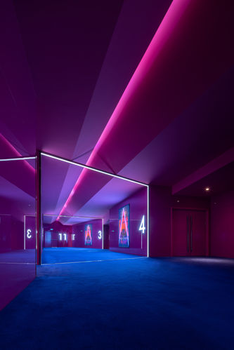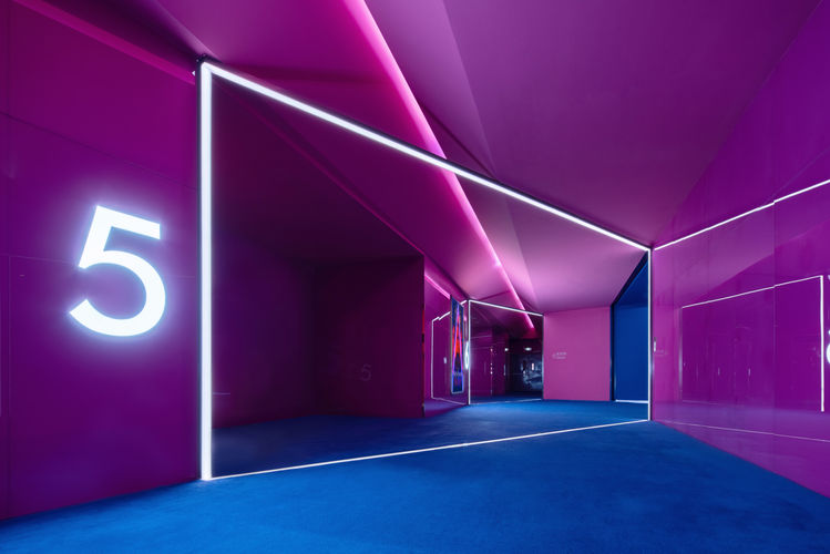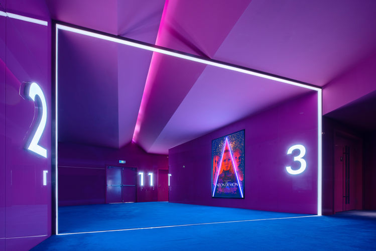 An intense tunnel-like space dyed in fuchsia leading to most of the cinema houses is “Neon Loft”. This area is inspired by the Avant Garde Cinema of the 80s and filled with neon portals creating oblique reflections bouncing off high gloss surfaces.