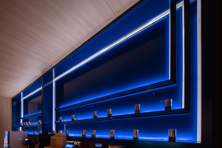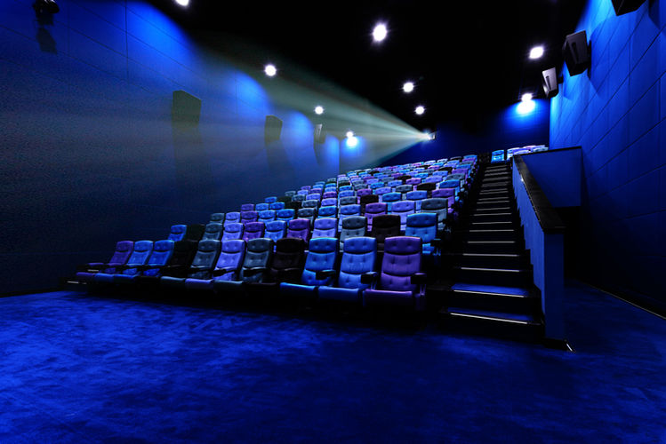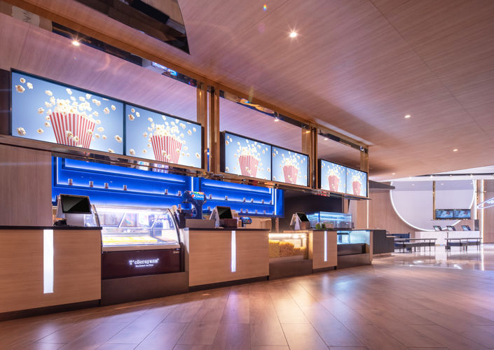 The main lobby consisting of the Box office and cafe is “Gallery Muse”. The area with stepped pyramid ceilings with artificial skylights and giant circular elements indicated as signage or abstract art pieces dominates the space.