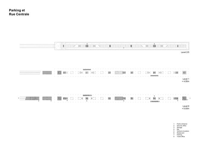 Elevated above the Rue Centrale and directly accessible from it is the carpark, a four-story elevated silo that sits right in the middle of the project. This building functions as a ceremonial entrance directly into the heart of MEETT, connected to the exhibition areas. It is an open building, to maximize the use of natural light and allow views into the expos from the parking lots.