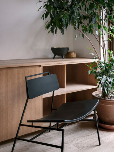 One of the project’s main components is its integrated furniture, situated on the ground floor. A hybrid space, it answers the family’s need for storage and for office space in the living area. APPAREIL Architecture created wooden furnishings with horizontal lines that host a couch, a desk, a buffet, and storage spaces. An elegant and efficient design that cleverly optimizes the space.