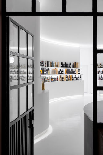 The shelves are carved out of the walls in reference to the vineyard terraces in a circular shape that fills the customer´s field of view sensitively with indirect lighting and the sharp contrast between the product and the space. This luminance creates the perfect background for the experience of observing the diversity the wine represents and a chance to take design back to its core in a chance to start something new. In this project we planned to celebrate the wine bottle, its shape and the brightness of its colored glass without lies – an interior using a simple form and the purest and neutral color.