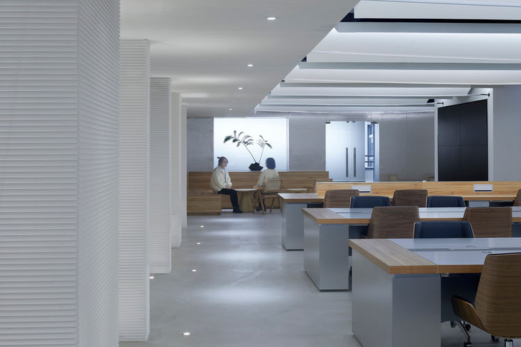 Studio DOTCOF has presented the concept of “working under the same roof”, which is a metaphor for collaboration between different branch companies on the group platform to develop and grow together. It has designed a number of long, white, cylindrical ceilings to form the semblance of large eaves. Then with light bars shining upward to brighten it, the light is guided through the arched ceiling and then refracted, forming a bright, soft, and diffusely-lit atmosphere. The long, cylindrical ceiling has put the untidy pipelines of the bare roof above out of sight, and at the same time the slight upward arch renders the low clearance less perceivable.