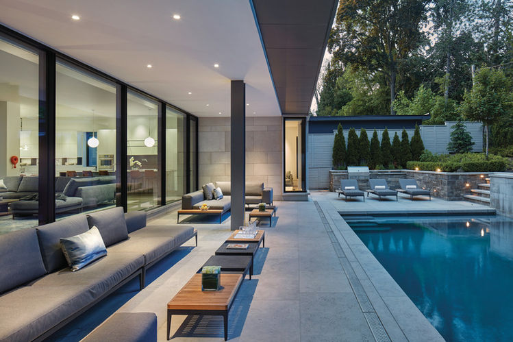 Taylor Smyth Architects and Cecconi Simone collaborated on the design of the house, with the sophisticated interiors custom designed by Cecconi Simone to incorporate bronze privacy screens, stone, wood paneling and built-in millwork.