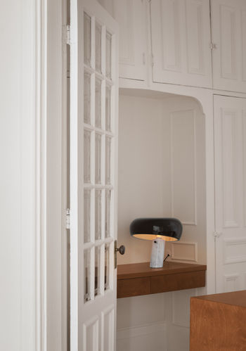 The office, adjacent to the master bedroom, is separated by french doors, allowing borrowed light into the space. The small hanging storage added to the existing alcove creates a contrast between old and new.