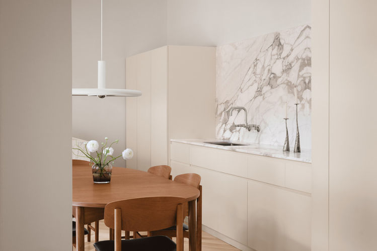 The wall-mounted faucet and marble backsplash become the focal elements of the kitchen and infuse character into the space. Natural stone, combining green and brown shades, is used to create a monolithic-style island, while the neutral colour of the kitchen cabinets allows the materiality of the stone to take center stage. High cabinets hide the pantry and refrigerator, whereas the lower section provides plenty of storage space.