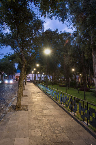 Given that the plaza today is best recognized for its handicraft and artist market, it was essential for the architect to give importance to artistic and manual processes. The modern version of the square no longer includes steps or slopes to block universal access, so the pathways were homogenized with volcanic cobblestone, using manual machete cuts against the stones to form a thematic texture throughout the square. To compensate for resulting variances in the angles and settings of the volcanic cobblestone, chinked stones were embedded by hand using a technique called rajueleado. Additionally, engineer Jorge Zinser developed a new lighting system to cover the entire public square, without being invasive, to make the space safe and accessible at night.