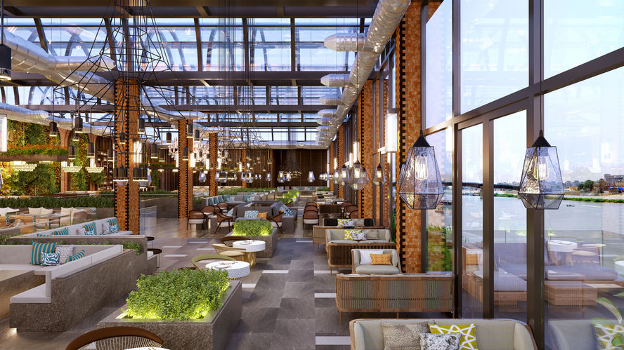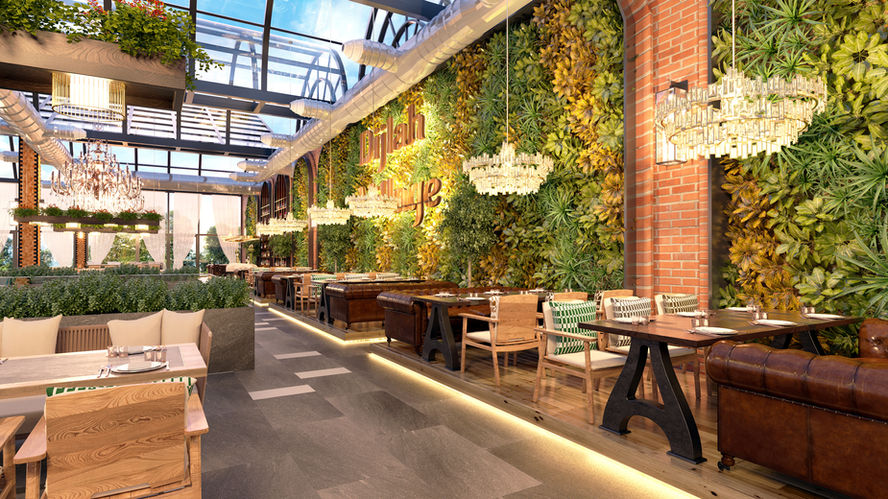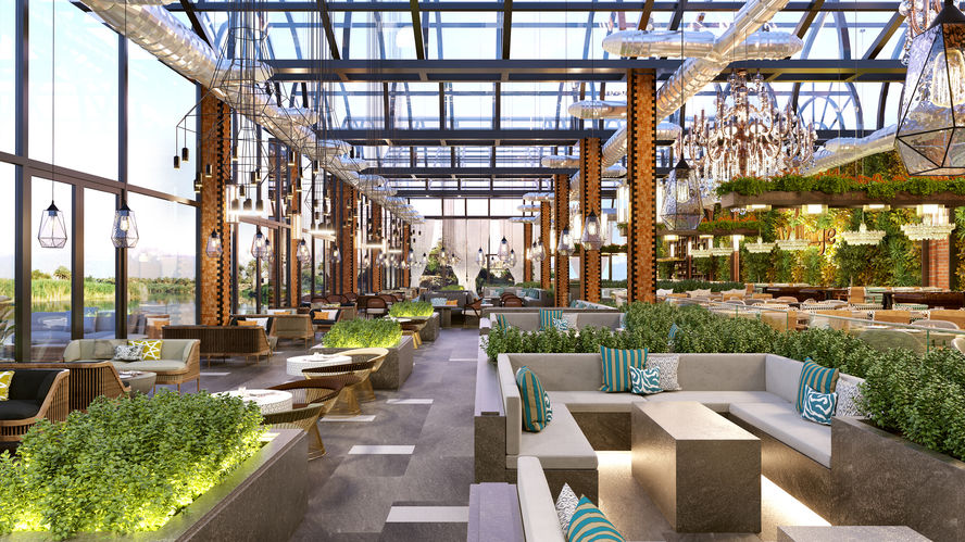 The main shisha hall is the central atrium designed with a glass ceiling. To divide and define the volume, planters are designed as modular partition elements which create a zestful space that can be reorganised corresponding to specific needs.