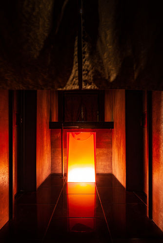 In the fire zone (Yakiniku), the ground is paved with imperial kiln bricks from the exquisite kiln of the Forbidden City and are dyed dark red with pigs blood. The groundwork also includes stone slabs that have been burnt multiple times at extremely high temperatures before being hit and crafted by hand. To create wooden partitions, discarded Douglas fir obtained from old Shanghai buildings was recycled and burnt through deep charcoal burning to create unique scale patterns. Upon a structure inlaid with luminous red-yellowish onyx, exuding a special pattern resembling multiple layers of flames, several other materials and LED light sheets combine to resemble elements of ‘fire’. The water (sushi) zone is mild, like water, in order to retain its essence. The ground is also paved with imperial kiln bricks, but in pure black. In the progress of creating painted art on the walls, golden powder was replaced with silver powder, resembling the the texture of water ripples. The firm selected quarry stone, aged for more than a decade under the scour and corrosive effects of rainwater. To add to the firm's artistic vision of ‘water’, the stone is used for the countertop backdrop, a cross-section of which is as rough as rocks dredged from a lake. Furthermore, additional details include an outdoor logo made of pure bronze and hammered by hand, providing a nod to the spirit of craftsmanship. Two specially designed alabaster pendent lamps, inspired by umbrellas and canoes from the East, are fused with iron as both a structural and decorative function. The storefront surface is fully covered with burnt cedar, free of any reflection, rendering it low-key and mysterious. Only upon opening the gate is the luminous onyx behind it exposed, giving way to an interior space like a Pandora’s box.